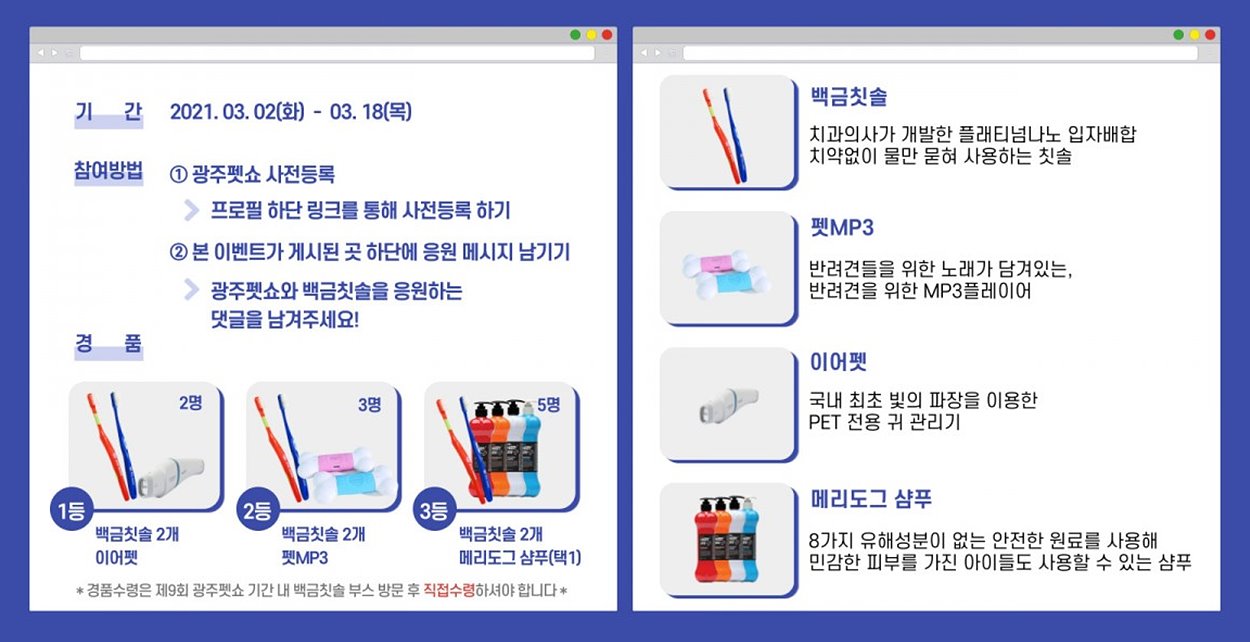 ※ 경품 수령은 제9회 광주 펫 쇼 기간 내 백금 칫솔 부스 방문 후 직접 수령하셔야 합니다.