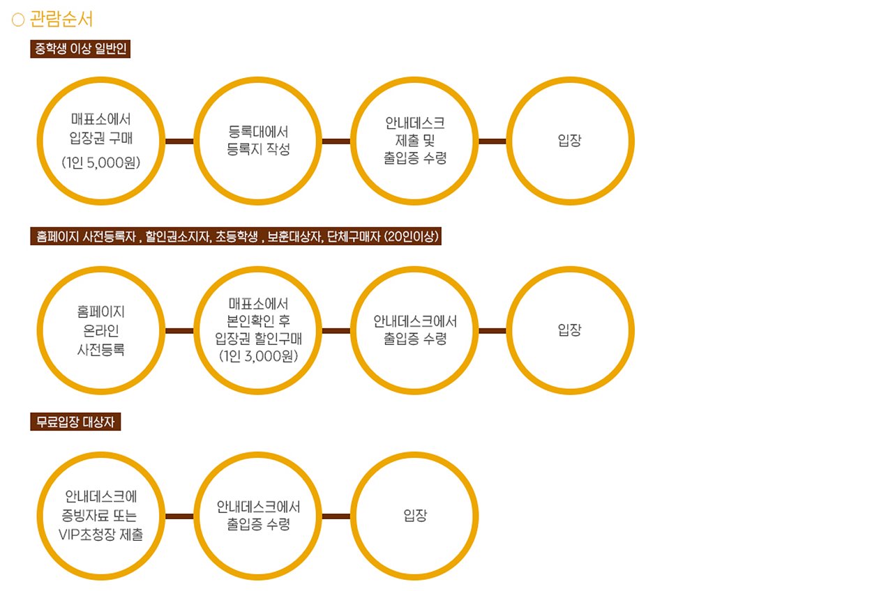 - 매표소에서 입장권 구매 (1인 5,000원) > 등록대에서 등록지 작성 > 안내 데스크 제출 및 출입증 수령 > 입장