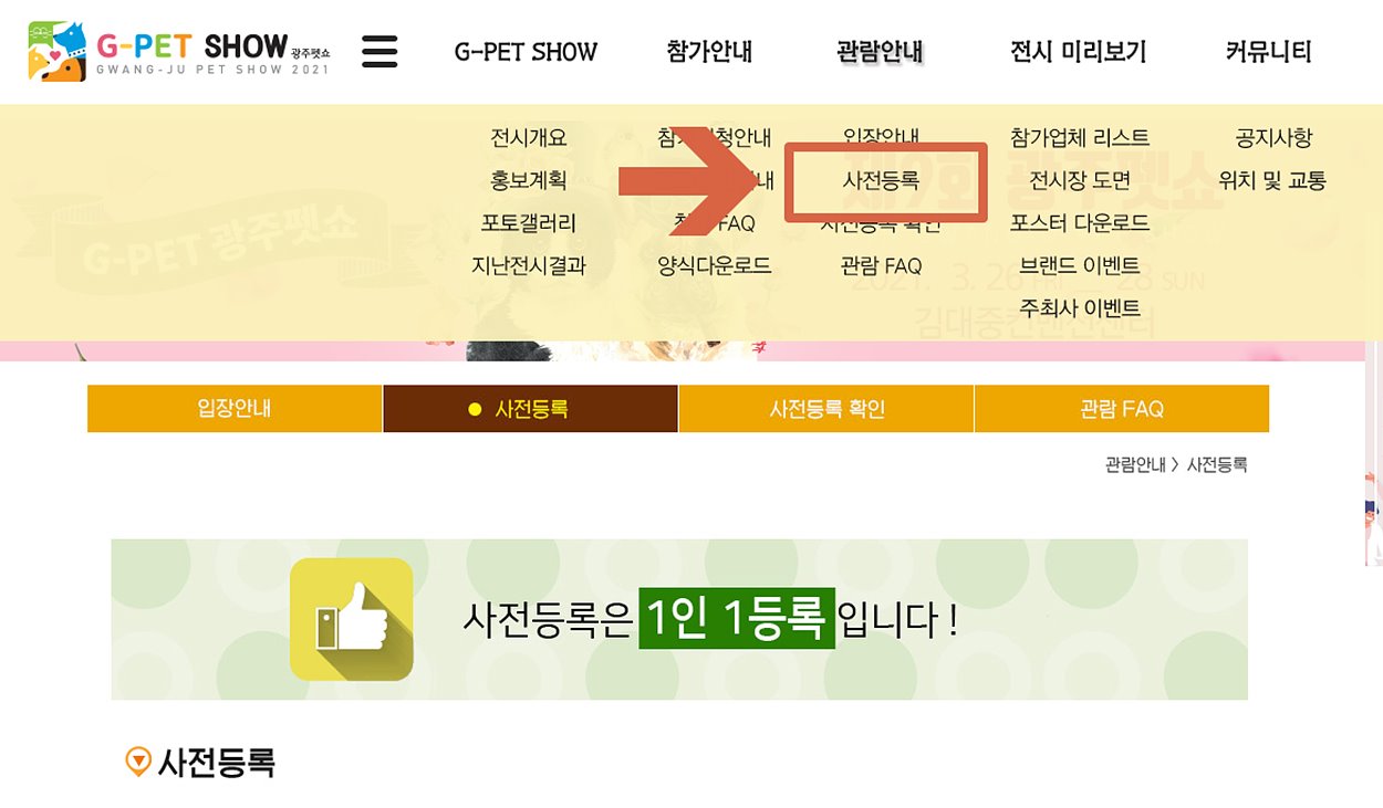 ⊙ 광주 펫쇼 공식 홈페이지 접속 후 상단 "관람 안내"에 있는 '사전 등록'을 선택하셔서 진행하시면 됩니다.