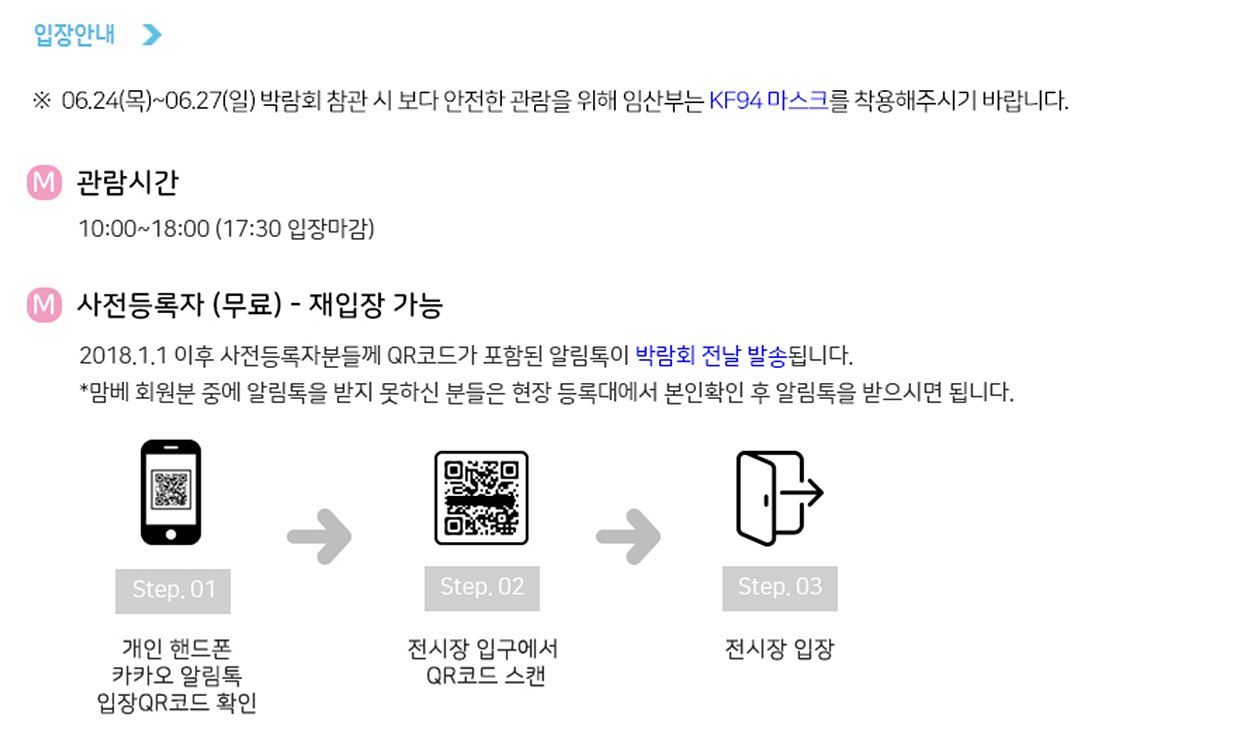 - 6월 24일 목요일 - 6월 27일 일요일 박람회 참관 시 보다 안전한 관람을 위해 임산부는 KF94 마크스를 착용해주시기 바랍니다.