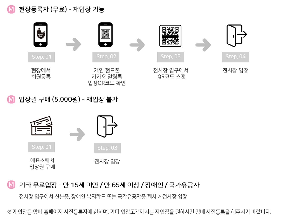 ※ 재입장은 맘베 홈페이지 사전 등록자에 한하며, 기타 입장 고객께서는 재입장을 원하시면 맘베 사전 등록을 해주시기 바랍니다.