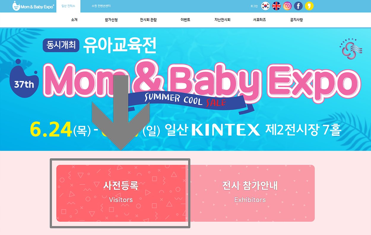⊙ 맘앤베이비 엑스포 공식 홈페이지 접속 후, 상단 "일산 킨텍스"를 선택하신 후에 중앙에 있는 "사전 등록" 버튼을 클릭하셔서 진행하시면 됩니다.