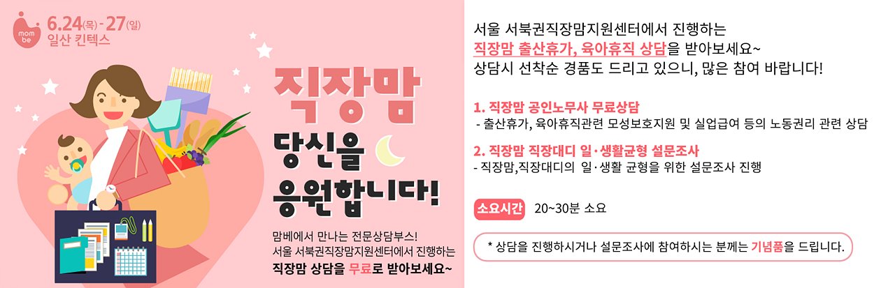 ⊙ 서울 서북권 직장맘 지원 센터에서 진행하는 직장맘 출산 휴가, 육아 휴직 상담을 받아보세요! 상담 시 선착순 경품도 드리고 있으니, 많은 참여 바랍니다.