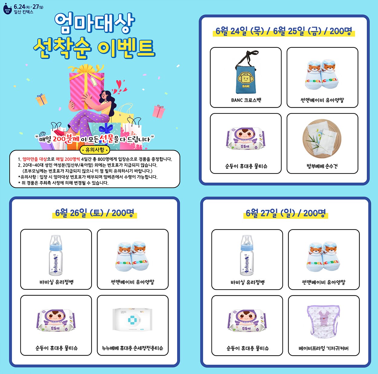 - 엄마만을 대상으로 매일 200명씩 4일간 총 800명에게 입장순으로 경품을 증정합니다.
