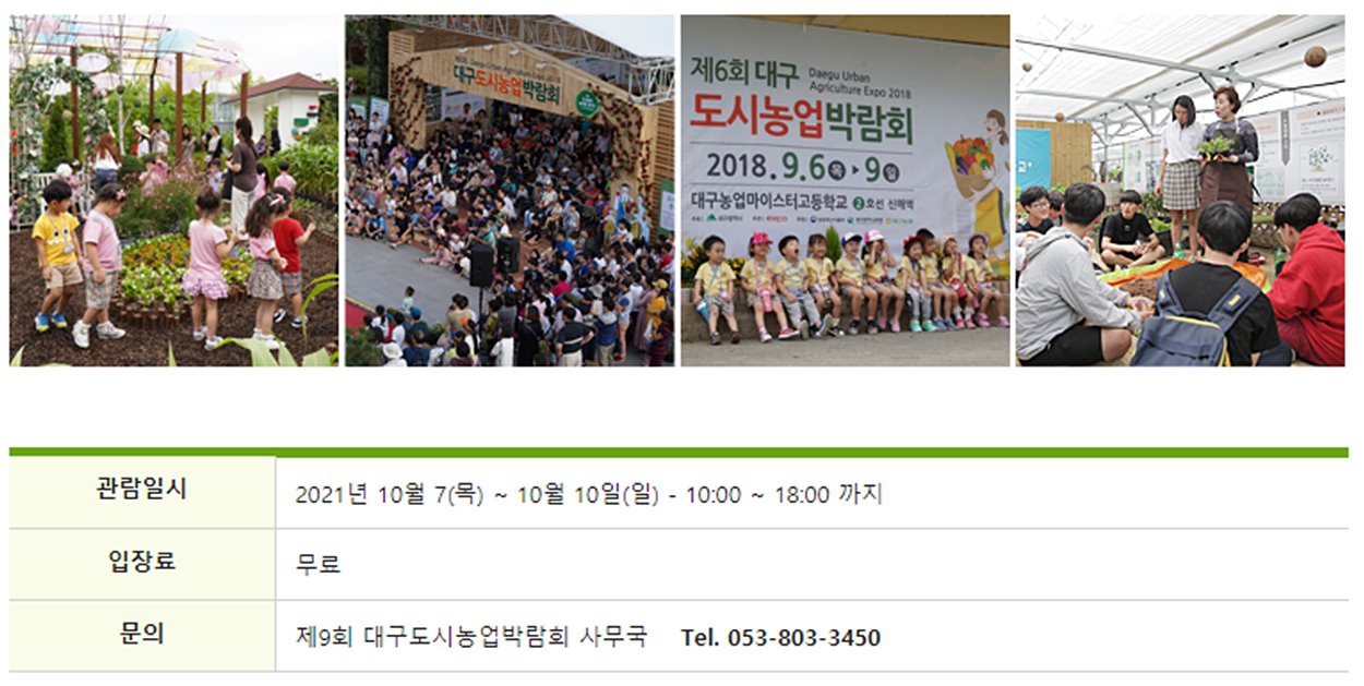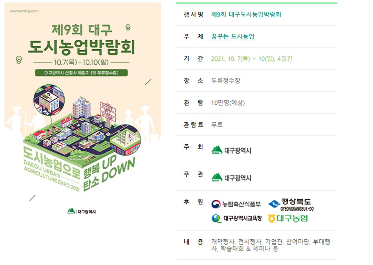 오늘은 2021년 10월 7일 목요일부터 10월 10일 일요일까지 4일간 대구광역시 두류정수장에서 개최하는 대구 도시 농업 박람회 2021 일정 및 관람 정보에 대해서 안내해드리려고 합니다.