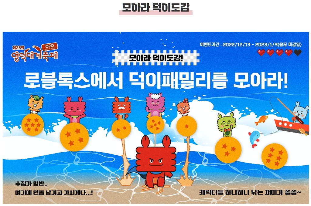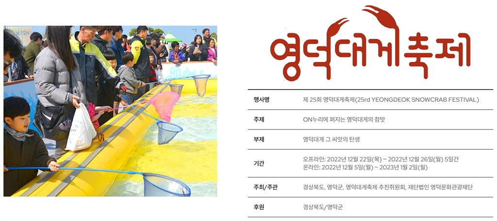오늘은 2022년 12월 5일 월요일부터 2023년 1월 2일 월요일까지 경상북도 영덕군에서 온라인과 오프라인에서 개최하는 2022 영덕 대게 축제 일정 및 정보에 대해서 안내해드리려고 합니다.