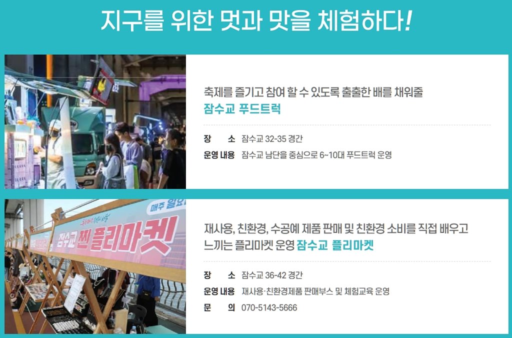 한강과 가장 가까운 한강 위의 축제! '차 없는 잠수교 뚜벅뚜벅 축제'가 한당 달빛 야시장과 연계하여 개최합니다. 놀며, 쉬며, 걸으며 멋진 한강의 노을까지 감상할 수 있으며, 맛있는 음식들을 한가득 파는 푸드 트럭뿐만 아니라 다양한 플리마켓까지 운영하다고 하니 친구, 가족, 연인들과 한 번 방문해 보시길 바랍니다.