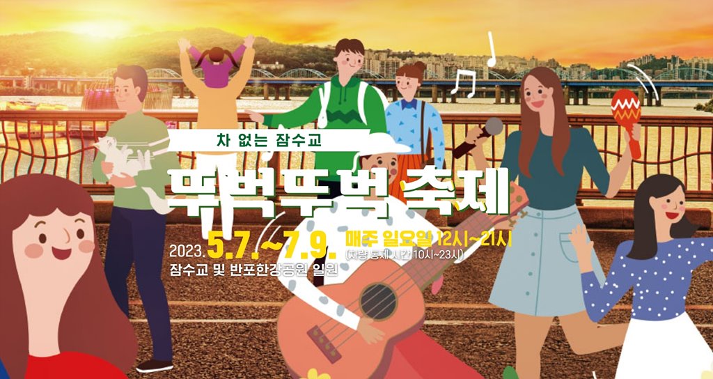 안녕하세요. 오늘은 2023년 5월 7일 일요일부터 2023년 7월 9일 일요일까지 매주 일요일마다 서울 잠수교 및 반포한강공원 일원에서 개최하는 2023 차 없는 잠수교 뚜벅뚜벅 축제 일정 및 정보에 대해서 안내해드리려고 합니다.