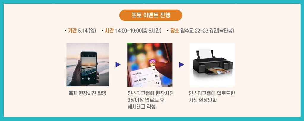 - 축제 현장 사진 촬영 > 인스타그램에 현장 사진 3장 이상 업로드 후 해시태그 작성 - 인스타그램에 업로드한 사진 현장 인화