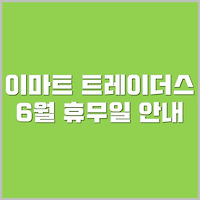2020년 6월 이마트 휴무일 안내안녕하세요. 오늘은 2020년 6월 이마트 휴무일에 대해서 안내해드리려고 합니다. 아래에 포스팅 되어 있는 휴무일 외에는 모두 정상 영업하며, 지점 사정에 의해 쉬는 매장이 있을 수 있으니 홈페이지 확인 및 매장 문의 후 방문해보시길 바랍니다. 코로나19 예방을 위해 손 씻기, 마스크 착용을 의무화 하고, 외출은 꼭 필요한 경우에만 하셨으면 좋겠습니다. (Ctrl + F 단축키를 사용하여 지점을 검색하시면 빠르게 검색이 가능합니다.) 함께 읽으면 더 좋은 포스팅 6월 14일, 28일 일요일 휴무 지점 안내⊙ 서울 - SSG도곡점, SSG청담점, 가든5점, 가양점 - 구로점, 마포점, 명일점, 목동점, 묵동점 - 미아점, 상봉점, 성수점, 수색점, 수서점 - 신도림점, 신..