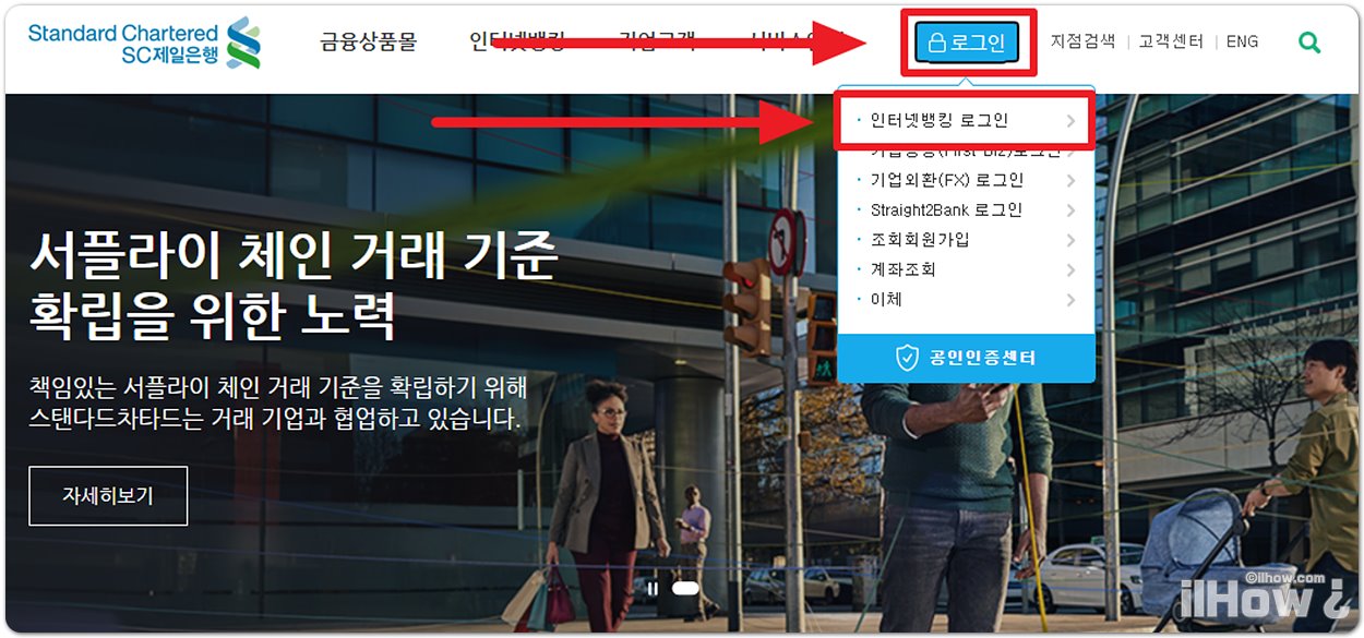 SC제일은행 인터넷 뱅킹 페이지 상단 "로그인" 버튼을 클릭하여 "인터넷뱅킹 로그인"을 진행해주시면 됩니다. 공동인증서(구공인인증서), PASS 등 개인 인증서를 통해서 로그인이 가능합니다.