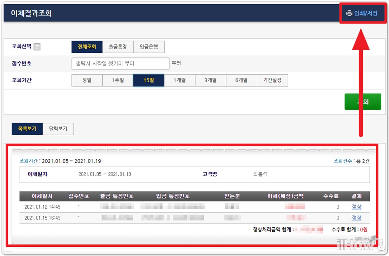 설정한 기간에 거래했던 모든 내역이 리스트로 표시됩니다. 해당 거래 내역을 출력하고 싶으신 분들은 상단 "이체결과조회" 박스 우측 상단에 있는 "인쇄/저장" 버튼을 통해서 출력 및 파일로 저장이 완료됩니다.