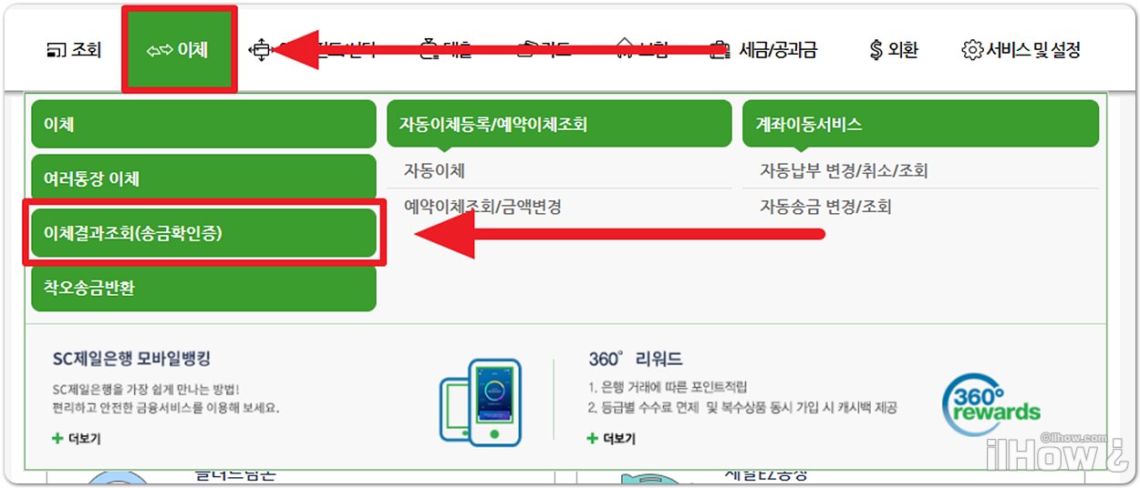 먼저 거래 내역서 조회 방법부터 알아보겠습니다. SC제일은행 인터넷 뱅킹 상단 메뉴에서 "이체 → 이체결과조회(송금확인증)" 순서로 클릭해주세요.